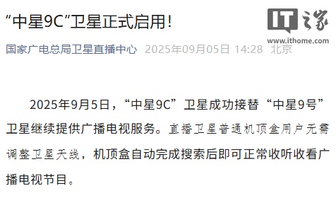 9 月 5 日消息,國家廣播電視總局宣布,“中星 9C”衛(wèi)星今日正式接替服役多年的“中星 9 號”衛(wèi)星,繼續(xù)為全國用戶提供廣播電視服務(wù),用戶無需調(diào)整設(shè)備即可正常接收信號。