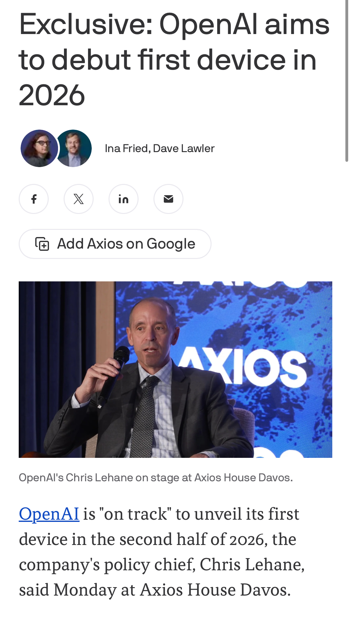據(jù) Axios 網(wǎng)站報道,OpenAI 政策主管克里斯 · 萊恩周一在達沃斯論壇透露,公司“正按計劃”于 2026 年下半年推出其首款設(shè)備。