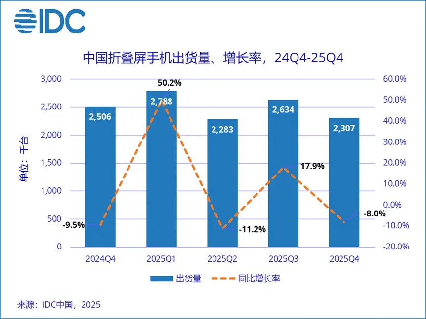 在折疊屏手機細分市場,2025 年第四季度出貨量為 231 萬臺,同比下降 8.0%,市場呈現(xiàn)階段性回調(diào)。全年折疊屏手機出貨量約 1001 萬臺,同比增長 9.2%,但增速已有所放緩。