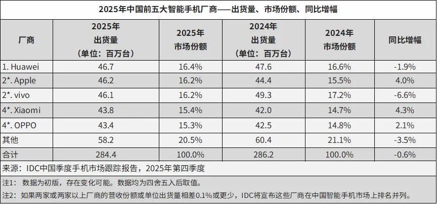 IDC:華為重返 2025 年中國智能手機市場出貨榜首,蘋果 iPhone 17 系列創(chuàng) Q4 單季新高、小米連續(xù)兩年實現(xiàn)增長