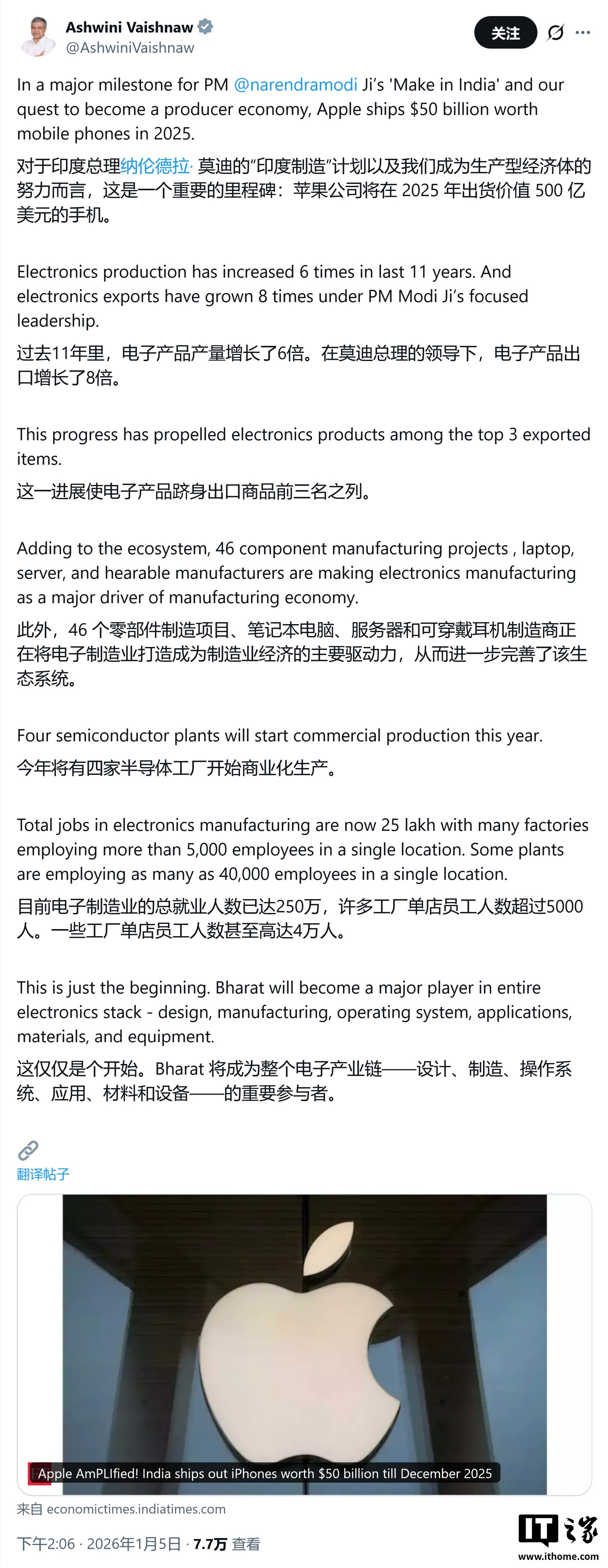 針對《經濟時報》的報道,印度鐵道、信息與廣播、電子與信息技術部長阿什維尼・瓦伊什納夫在 X 平臺上表示,500 億美元是一個“重要的里程碑”,他將這一成就歸功于政府的“印度制造”計劃,并表示“過去 11 年里,電子產品產量增長了 6 倍”。