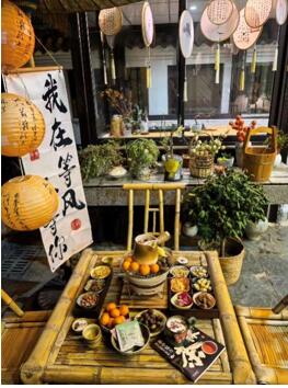 眼前的沈莊民宿,處處透著一股雅致的古色古香。門口懸掛的紅燈籠輕輕搖曳,墻邊錯落擺著各式盆栽,竹椅、茶臺隨意散落在檐下,一旁的遮陽傘半敞著,顯得格外清靜閑適,與三公里外上海迪士尼樂園的熱鬧恍若兩個世界。