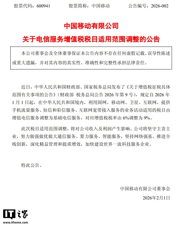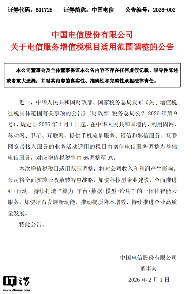2 月 1 日消息,中國電信、中國聯(lián)通、中國移動三大運(yùn)營商今日發(fā)布公告,宣布將電信服務(wù)增值稅稅目適用范圍調(diào)整稅率由 6% 調(diào)整為 9%。IT之家附原文如下: