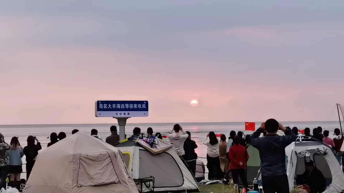 臘月廿五,鹽城大豐。從上海第一次回婆家過(guò)年的設(shè)計(jì)師周曉鷗和丈夫站在灘涂邊等日出。晨光躍出水面的那一刻,她按下了錄制鍵,把冬日清晨的日出分享進(jìn)家族群。早起的爸媽叔嬸們?cè)谌豪锩牖亍昂每础焙痛竽粗福榫w價(jià)值給得夠快夠足。
