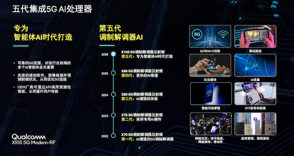 高通X105內(nèi)置的第五代5G AI處理器,專(zhuān)為智能體AI時(shí)代打造,能夠利用調(diào)制解調(diào)器內(nèi)的智能體AI實(shí)現(xiàn)連接能力提升。先進(jìn)的感知軟件,能夠檢測(cè)并預(yù)測(cè)射頻狀況,從而優(yōu)化5G連接。OEM廠商可通過(guò)API調(diào)用預(yù)測(cè)性智能,最終提升不同用戶場(chǎng)景下的性能,帶來(lái)卓越的5G-A性能與用戶體驗(yàn)。