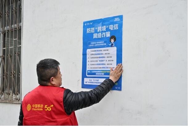 陳鋒下鄉(xiāng)粘貼反詐海報,為寨根鄉(xiāng)桑樹村村民講解反詐
