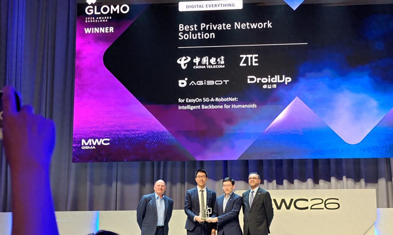 2026年世界移動通信大會(MWC26)期間,備受矚目的GSMA全球移動大獎(GLOMO Awards)正式揭曉。中國電信上海公司(以下簡稱“上海電信”)攜手中興通訊、智元機器人、卓益得機器人,憑借創(chuàng)新方案“EasyOn 5G-A RobotNet”,一舉摘得“最佳專網解決方案獎”(Best Private Network Solution)。這一殊榮不僅有力印證了中國電信在5G-A與具身智能融合領域的創(chuàng)新實力,也充分體現了上海電信聚合產業(yè)生態(tài)、推動AI+戰(zhàn)略落地取得的實質性成果。